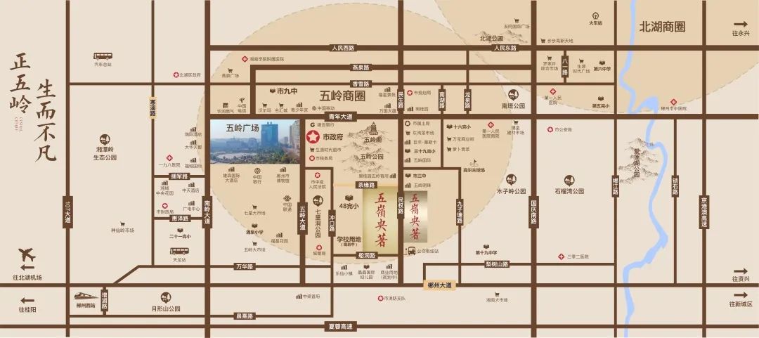 五岭央著位于“五岭商圈”中芯区,是郴州“南延、东进”战略要地,是郴州行政和商业两大中芯的集群区,集行政、酒店、文化、商业四位一体。