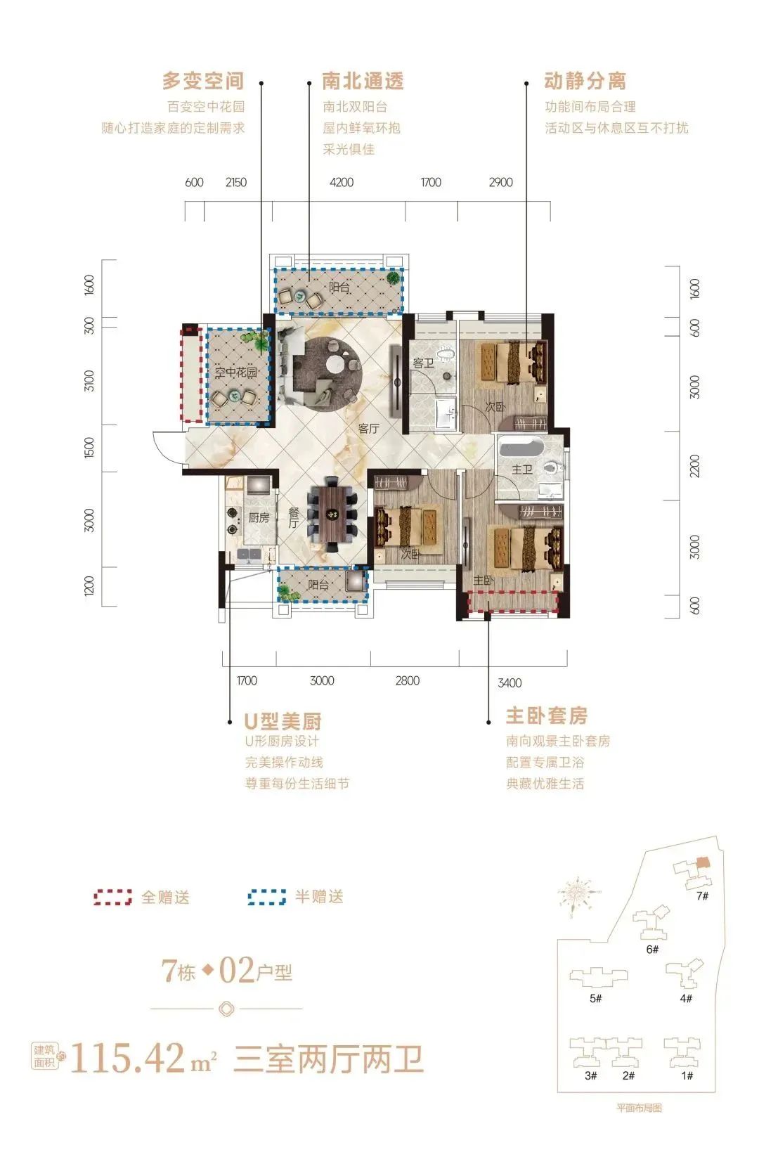 建面约115.42㎡3+1室两厅两卫,在餐厅、客厅、阳台一体的基础上,实现观景功能再升级。南北双阳台,通透格局,将阳光清风常驻家中。更值得一提的是,建面约115.42㎡户型,打造了全明空间,做到了的室内格局。