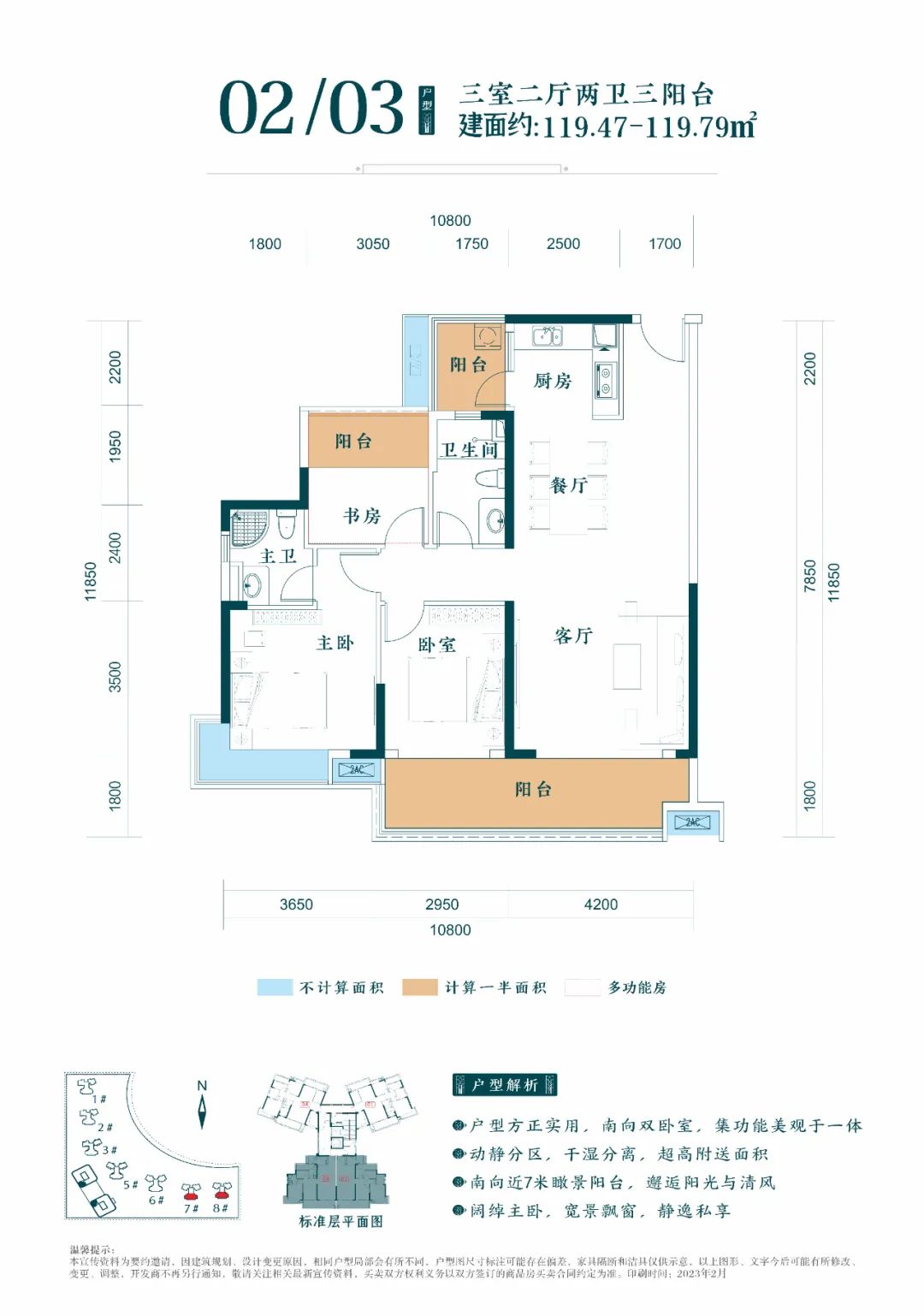 同时,119㎡采用三房设计,预留约10㎡灵动空间,二人世界时,可打造为健身房、游戏间、书房等,浪漫时光尽情享受;当宝宝来临,书房变成育婴室,方便放置宝宝物品,孩子成长后,育婴室升级为儿童房,让孩子独立的起居空间装满梦想。