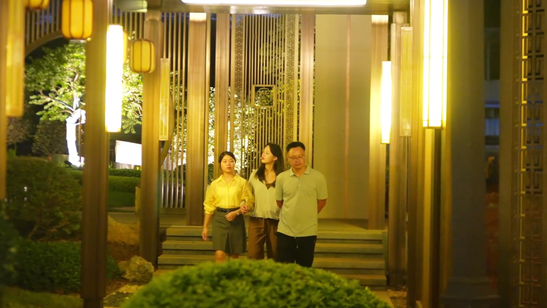 一家人饭后在新中式园林里漫步