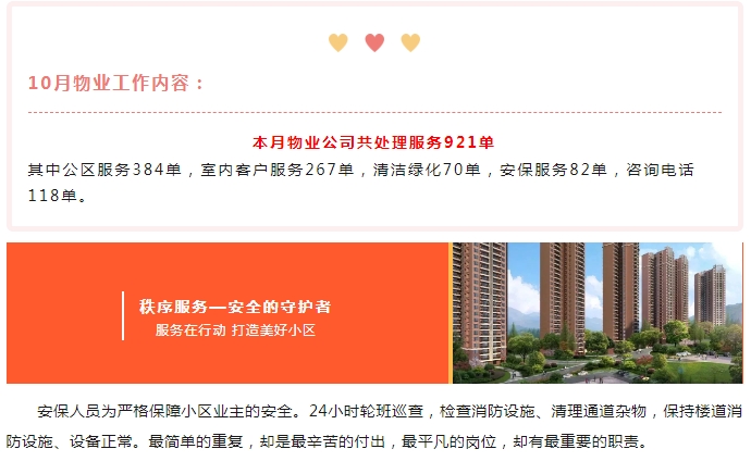 您好!十月深秋,寒露渐露,五彩斑斓的秋叶为小区装点出一幅丰富的画卷。为构建和谐小区,营造一个优美、安全、舒适、文明的居家环境,不断提升物业管理公司服务水平,现将10月份物业服务简报呈现于您,以便您了解并与我们共同监督物业服务工作。同时在文章尾部评论区希望您能提出宝贵意见及建议,我们会对您的意见及时反馈,并督促物业公司进行整改。