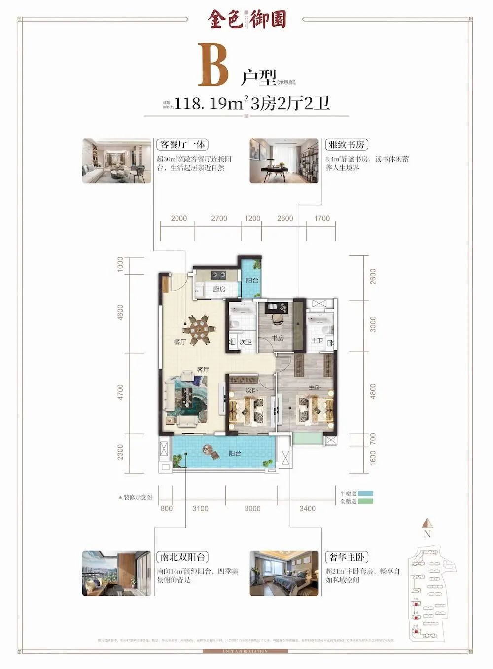 ②建面约118㎡实用三房,户型全明方正。超30㎡宽敞客餐厅连接阳台,生活起居亲近自然;南北双阳台,南向14㎡阔绰阳台,四季美景俯仰皆是,且没有过道面积的浪费,造就了户型的高利用率。