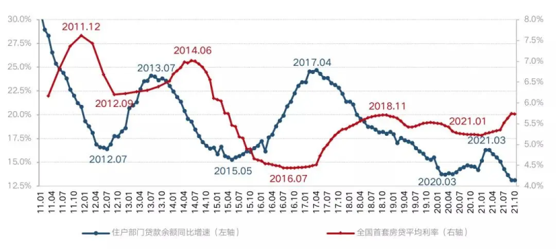 (图:住户部门贷款余额同比增速和全国首套房贷平均利率)