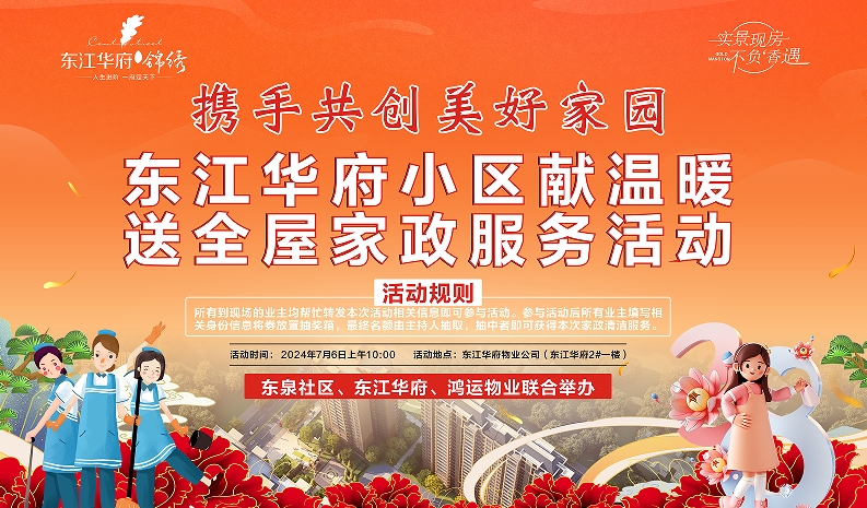 对家人的关怀,不只是于居住更是在于生活。更加注重细致入微的物业服务,为业主提供更好,更专业的服务,让业主居家生活温馨舒适,是东江华府的美好愿景!