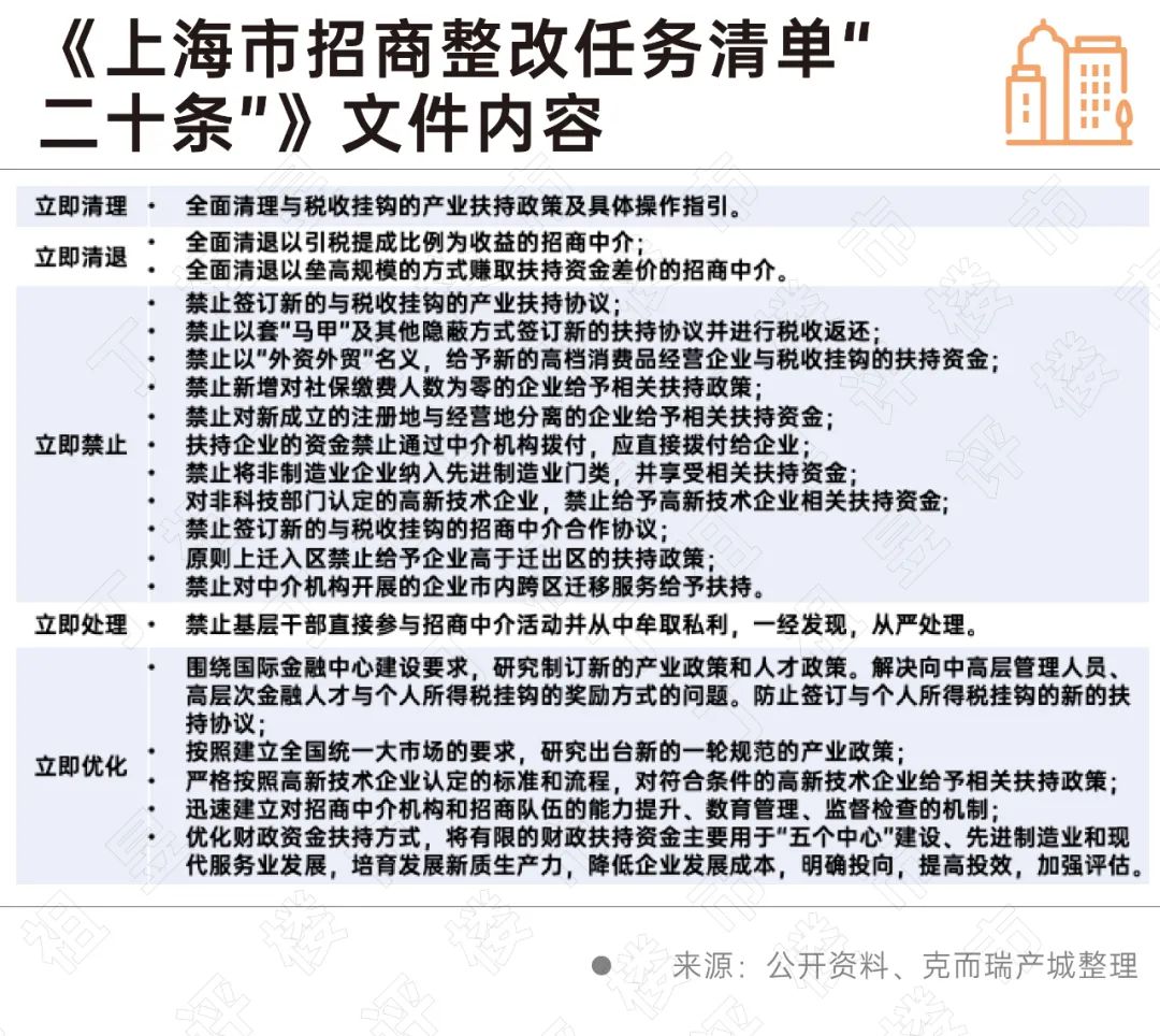 我们先来看看上海“二十条”都有哪些要求,造成行业内如此大的影响。“上海招商整改20条”主要分为“立即清理”“立即清退”“立即禁止”“立即处理”和“立即优化”五大部分,语气轻重不同也蕴含了不同的态度。