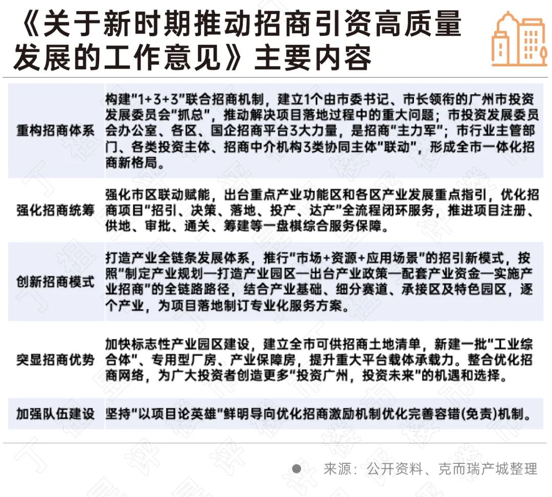 落到本轮招商政策来看,从组织体系、组织模式、招商模式、招商要素、招商队伍等重要环节方面都更加注重完善系统,以合力来配合产业招商。此外,从招商统筹的项目招引、决策、落地、投产、达产全流程闭环服务和“制定产业规划—打造产业园区—出台产业政策—配套产业资金—实施产业招商”招商全链路路径看出,营商环境更加全面细致,只要你有好项目,立马高效帮你落实,这点值得各地政府借鉴学习,与其等着项目“一事一议“,不如所有项目都可以“周全以待”,将有助于留住项目。产业园区是承接产业的重要载体,广州未来也将打造更多标杆项目,对于产业园区开发主体来说,将有更多发展空间,可以期待一下后续广州政府对于优质产业载体的相关激励政策。