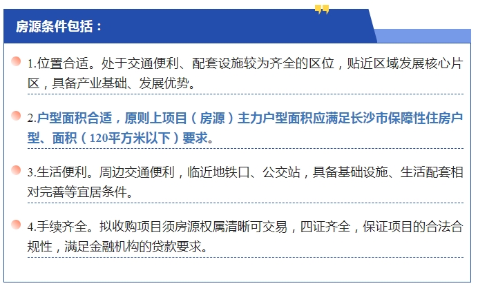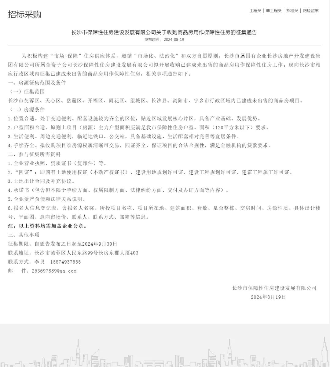 《通告》称,为积极构建“市场保障”住房供应体系,遵循“市场化、法治化”和双方自愿原则,长沙市属国有企业长沙房地产开发建设集团有限公司所属全资子公司长沙保障性住房建设发展有限公司拟开展收购已建成未出售的商品房用作保障性住房工作。