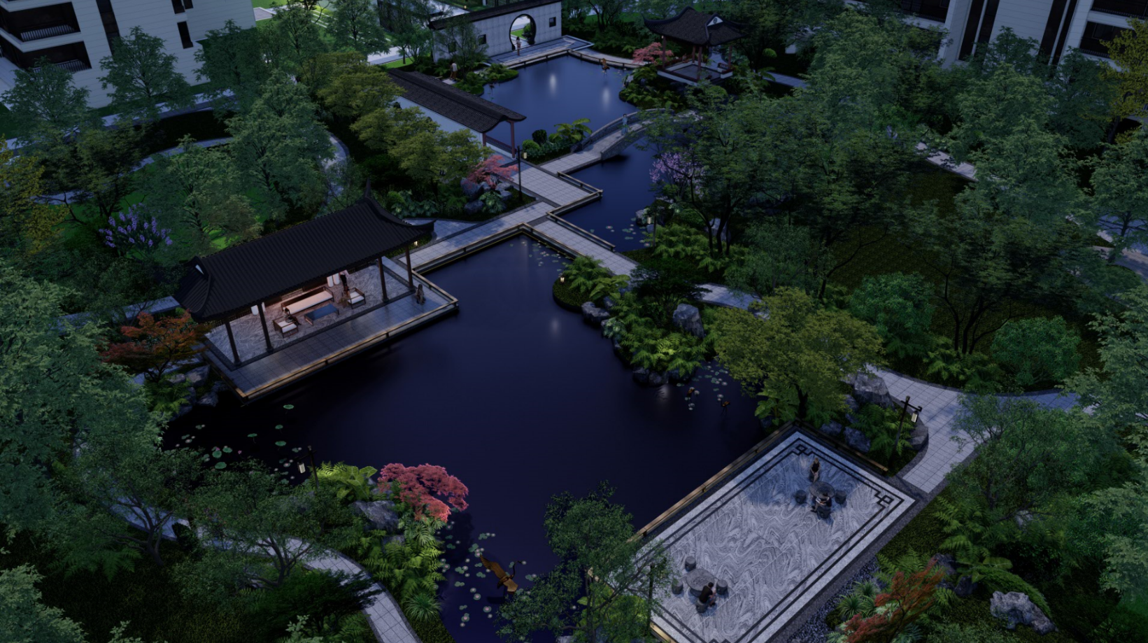 此次园林实景开放,涵盖了青云大道、由月洞门、造型松和景观石组层的园林景致、约1000㎡的中心湖景、由拱桥串联起的爱晚亭与廊亭。赏景、休憩、游玩,一分安然,一分别致。