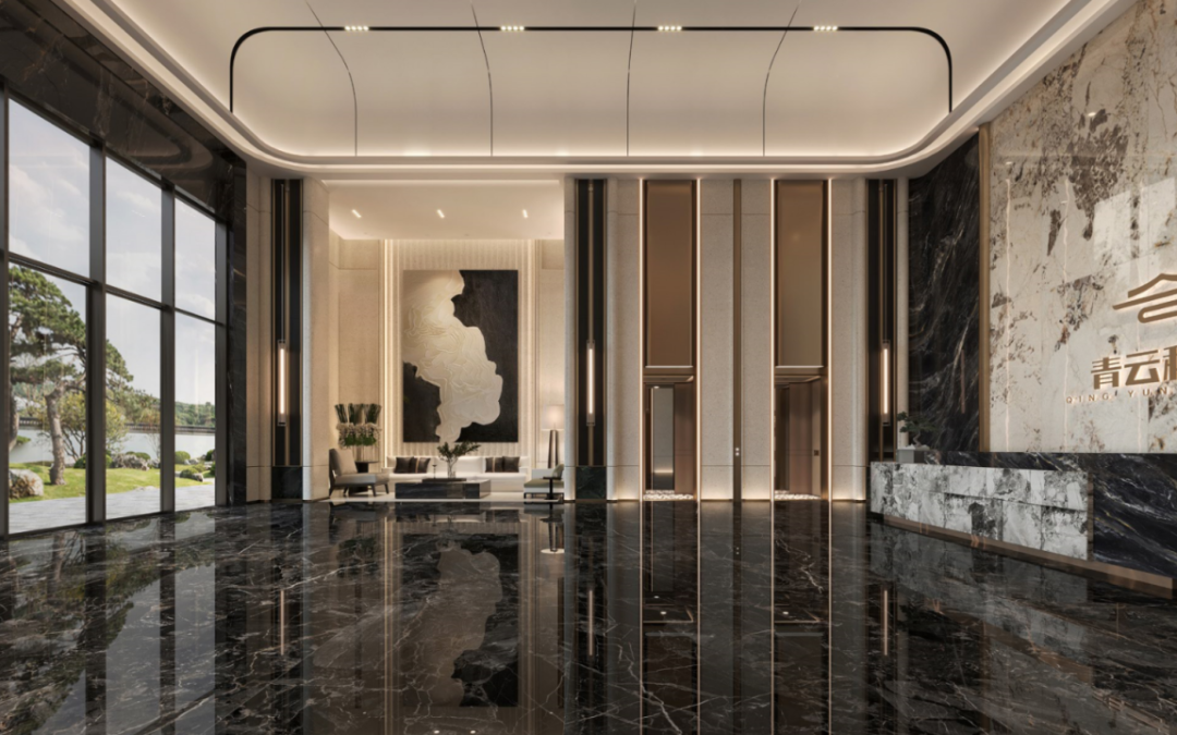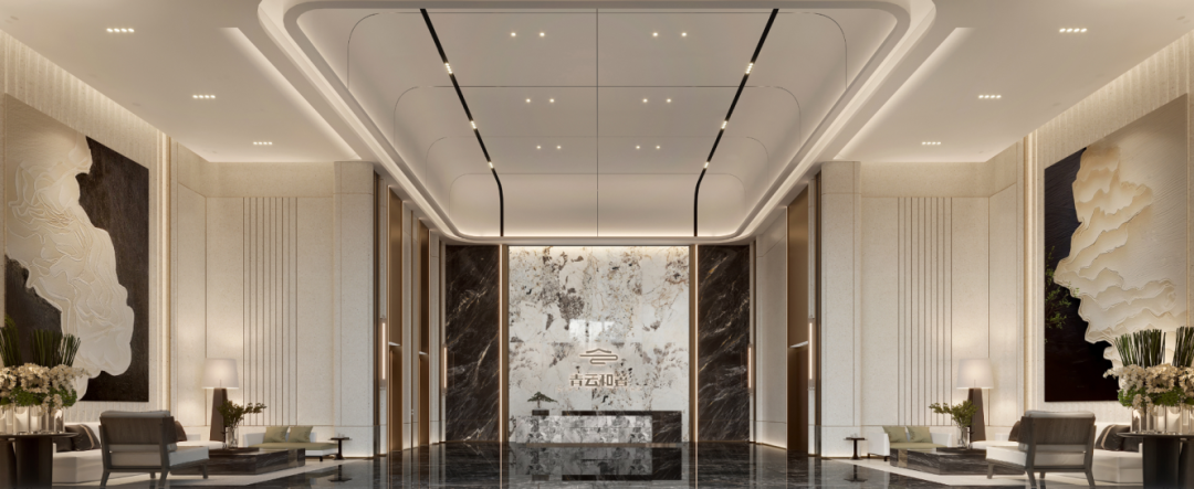 青云和著采取庄重奢华的星级酒店式归家大堂设计,整体宽度高达约33米、高度约17米,入口顶部采用劳斯莱斯星光顶雨棚、铝单板黄金切割工艺、玻璃幕墙,大堂内部挑高6.5m,墙面/地面均采用高档进口大理石、奢石,两侧为海派大师手绘的油画,构筑高雅归家场域。