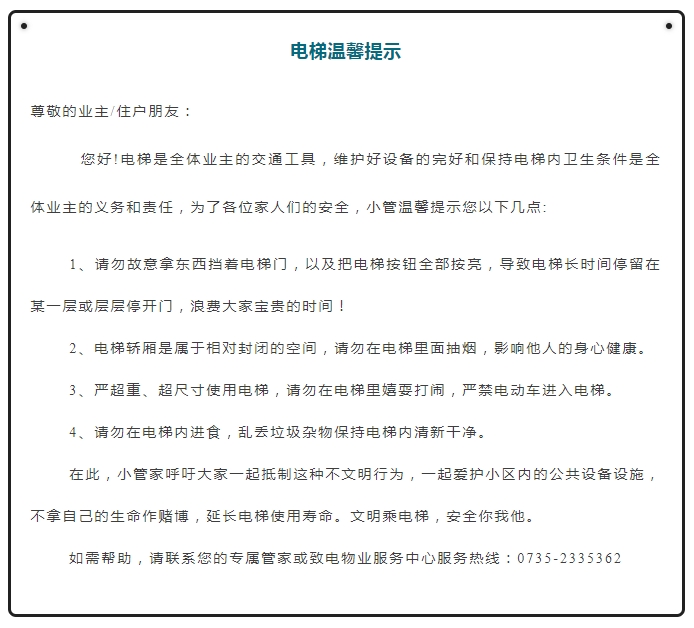 以上为九月的工作情况,我们将持续为大家提供更优质的服务,努力改进,力争为业主们带来愉悦的感受!如您有需要可及时致电24小时服务热线:0735-2335362,我们将竭诚为您服务!