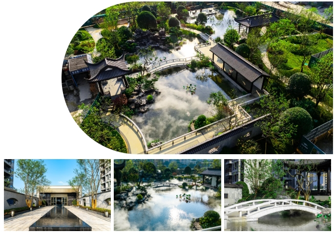下一站,我们来到了郴州首家岭南山水园林。从寓意着“平步青云”的青云大道穿过,我们来到了超3万方的中庭景观园林,约1000㎡映月锦鲤池、亭台水榭,曲廊楼阁、景墙漏窗皆在眼底,置身其中,仿佛一秒穿越水墨江南画卷之中。