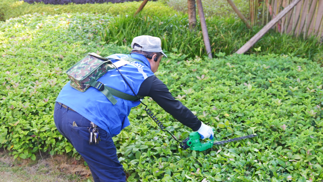 绿化工根据季节特性、园区造景需求,并结合不同植物的种类、特性,开展修剪、补栽、灌溉、病虫害防治等工作,用专业工具绘出美景,让园区时刻充盈勃勃生机。