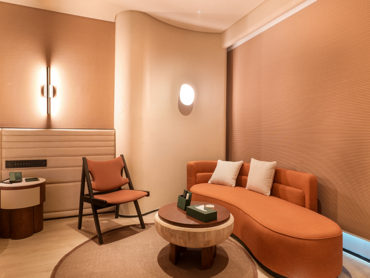 公共空间的建筑结构巧妙地引入了山风、山景和蓝天,结合建筑拱形门与顶棚、栏杆线性镂空围合出多元化社交场景。设计师们运用纯粹的材料与线条,构成场景氛围的趣味性,并以序列化的构成,将空间叙事性表达得淋漓尽致。每个房间都以其独特的姿态,为客人探索各种生活方式提供启发。