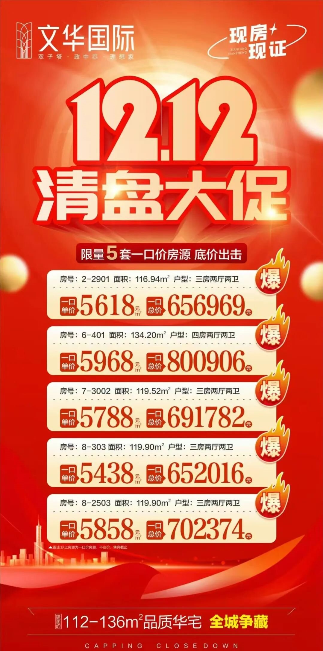 年终喜逢双十二,文华国际清盘大促,点燃年终置业狂潮。除了清盘85折钜惠,更有5套特价好房底价出击,诚挚回馈一路相伴,最后房源,限量争藏!