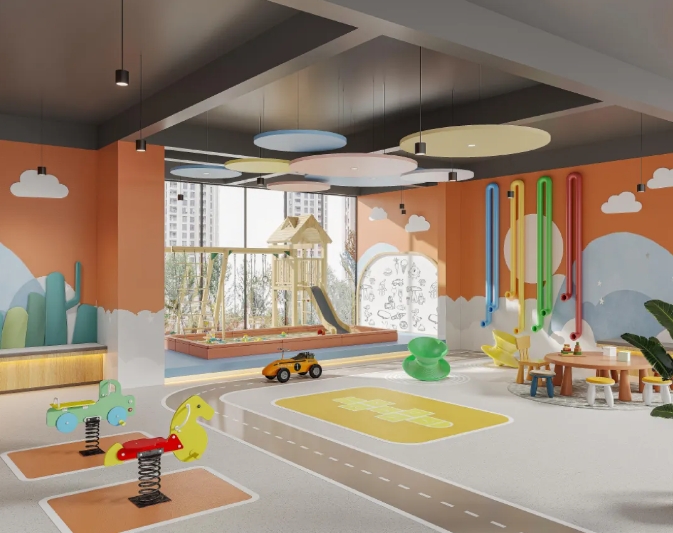约300㎡架空层泛会所,营造儿童“乐活天地”及成人“健身中心”两大主题场所,打造如涂鸦墙、滑滑梯、跷跷板、健身中心等休闲娱乐设施,为业主提供全时段共享空间,以舒适、和谐、尊崇的姿态拥抱生活。