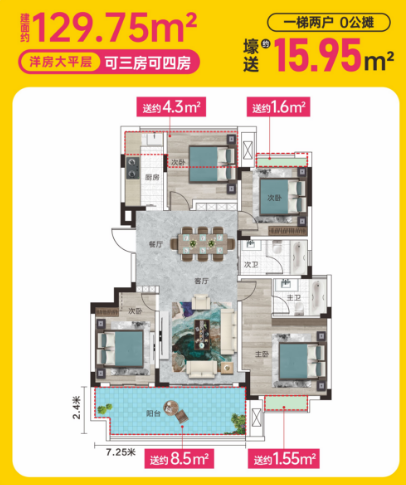 建面约129㎡洋房大平层,近乎0公摊,约7.2米瞰景阳台,视野开阔,赠送面积约15.95㎡,可三房也可做四房。