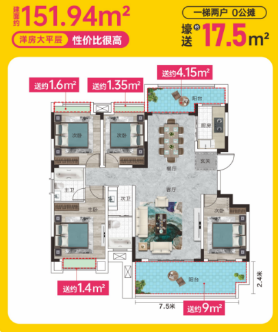 建面约151㎡洋房大平层,南北通透,三面采光设计,明厨明卫不带暗间,动静分区,赠送面积高达17.5㎡。