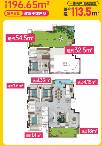 建面约196㎡顶层复式景观洋房,高赠送高得房,赠送约73㎡南北星空露台,生活跃层,上下有度,享受别墅级尊贵居住体验。